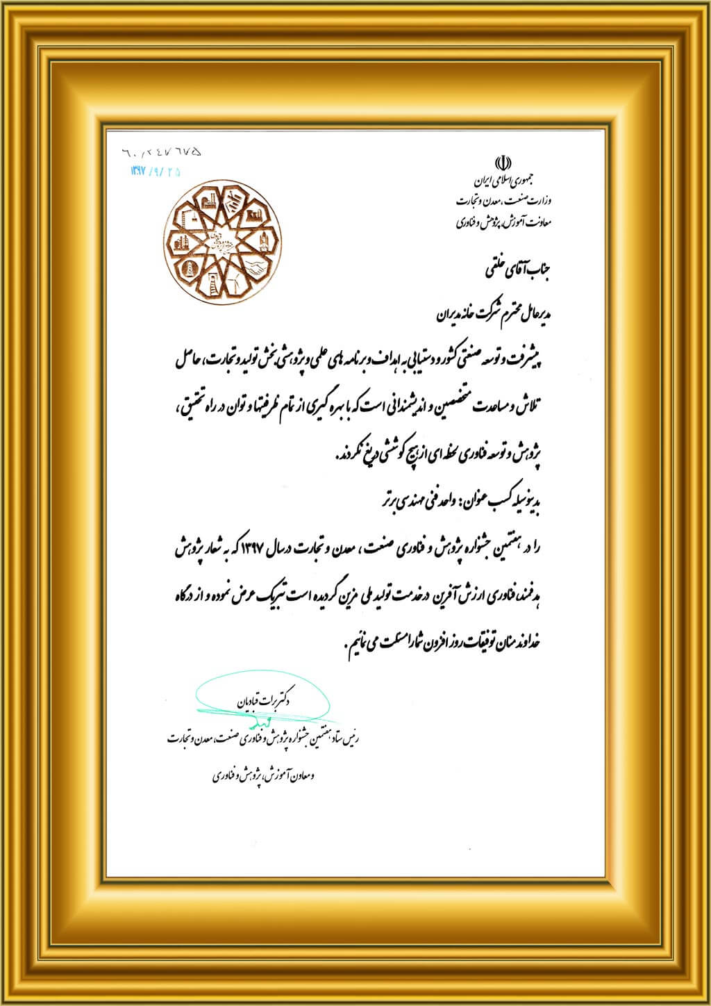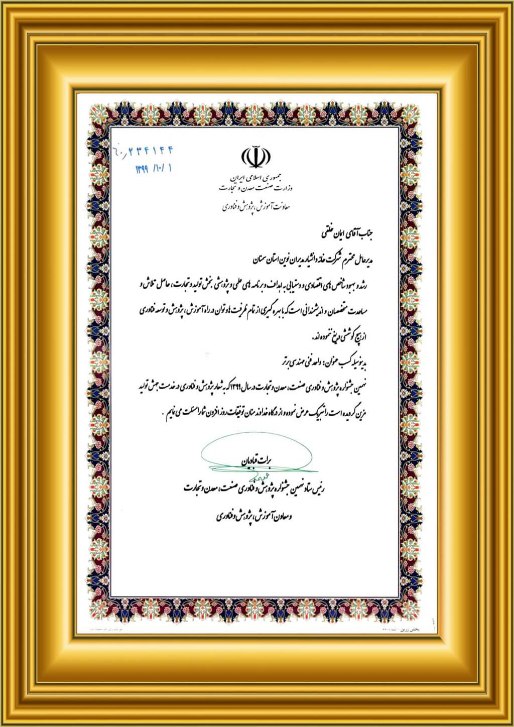 - وزارت صنعت، معدن و تجارت از این مجموعه با عنوان رتبه اول در سطح کشور تقدیر کرده است.