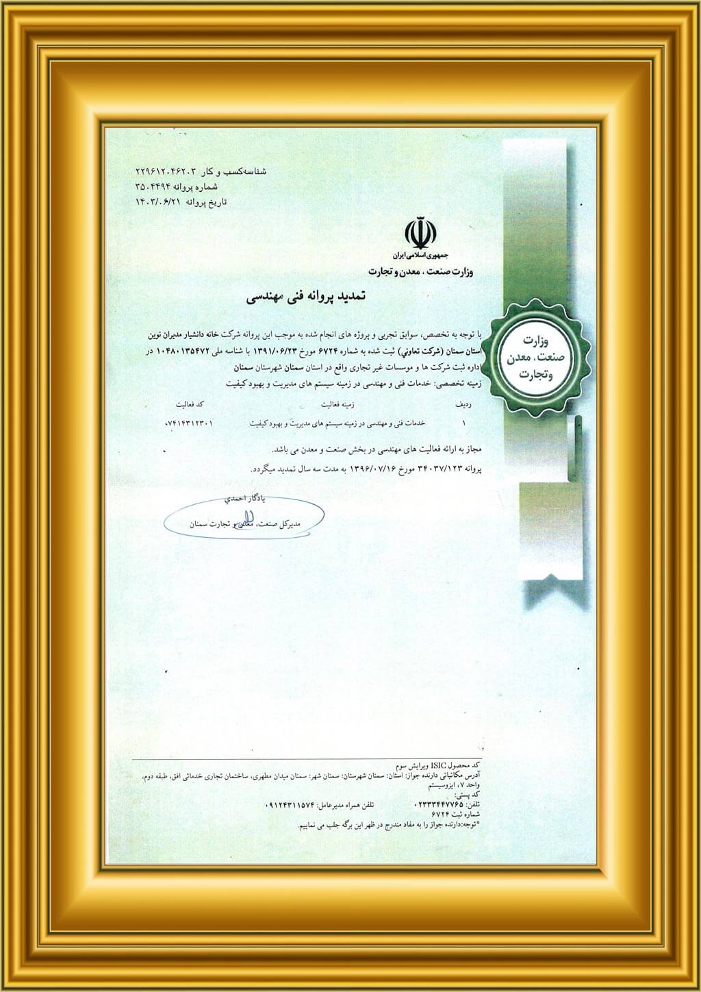 - دارای پروانه رسمی خدمات مشاوره مدیریت و کیفیت از سازمان صنعت، معدن و تجارت (به شماره مجوز ۱۲۳/۳۴۰۳۷)
